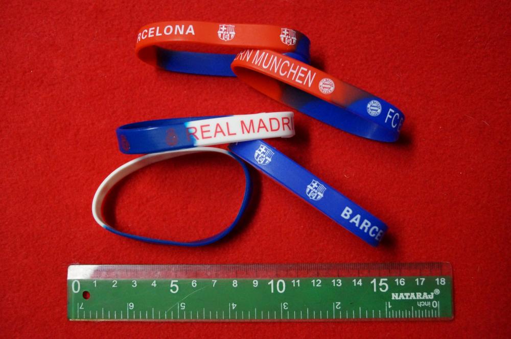 Klasyczna bransoletka silikonowa z nazwami klubów piłkarskich m.in. Barcelona, Real Madrid, FC Bayern Munchen.
