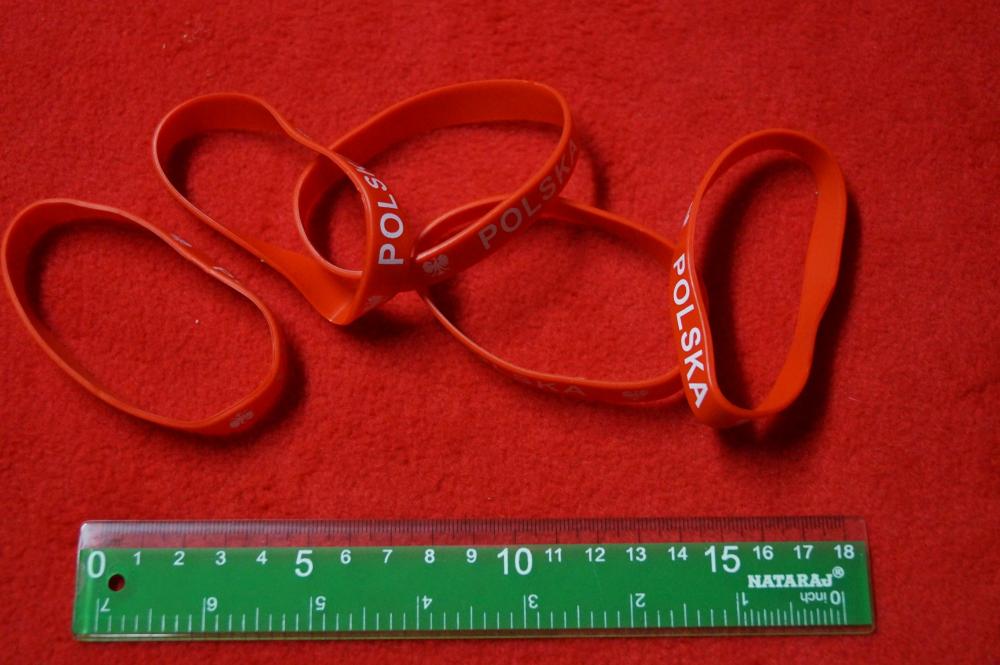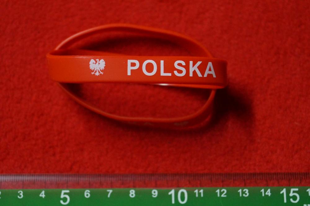 Kibicujemy Polsce. Klasyczna bransoleta silikonowa na rękę, z napisem "POLSKA" w kolorze biało-czerwonym.