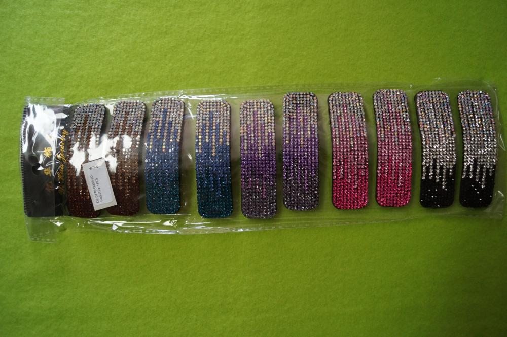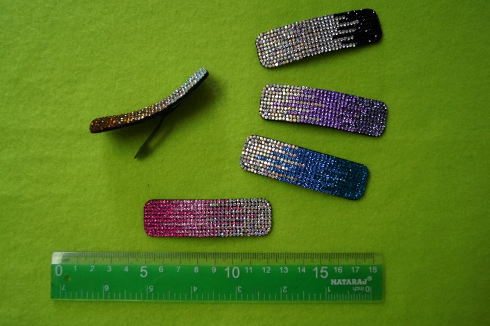 Duża prostokątna spinka typu pyk, z kryształkami o metalicznym połysku. Mix kolorów.