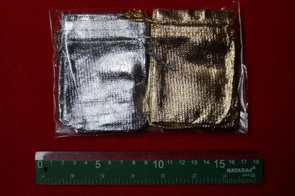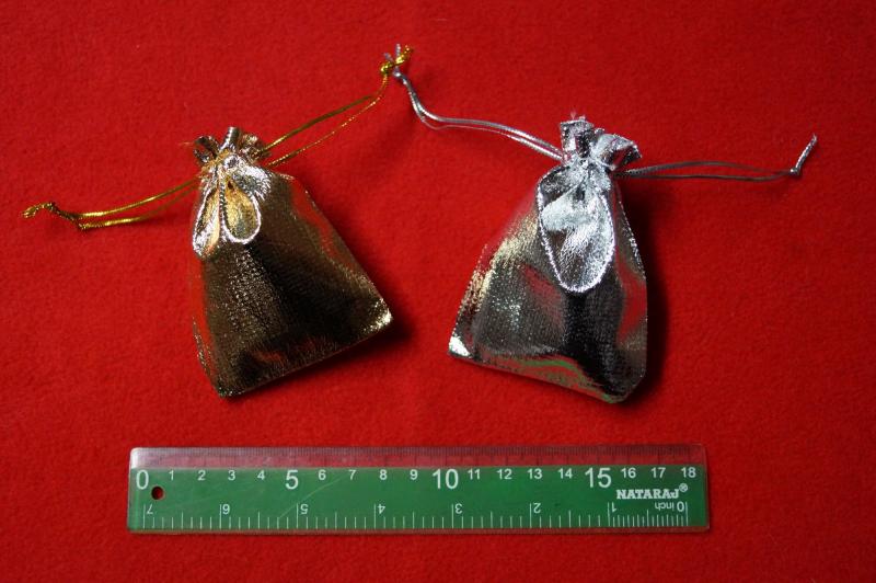 Ładne opakowanie na drobne upominki w kształcie woreczka - sakiewki w kolorze złotym i srebrnym. Wymiary: 7cm x 9,5 cm.