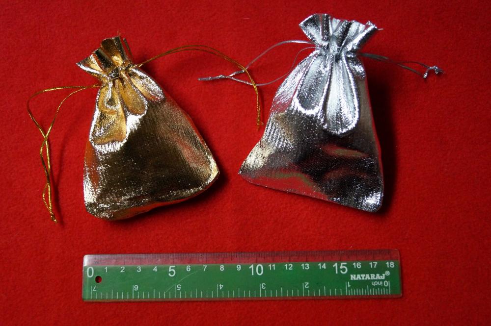 Ładne opakowanie na drobne upominki w kształcie woreczka - sakiewki. Rozmiar: szerokość 9 cm i długość 12 cm. Mix kolorów: srebrne i złote.