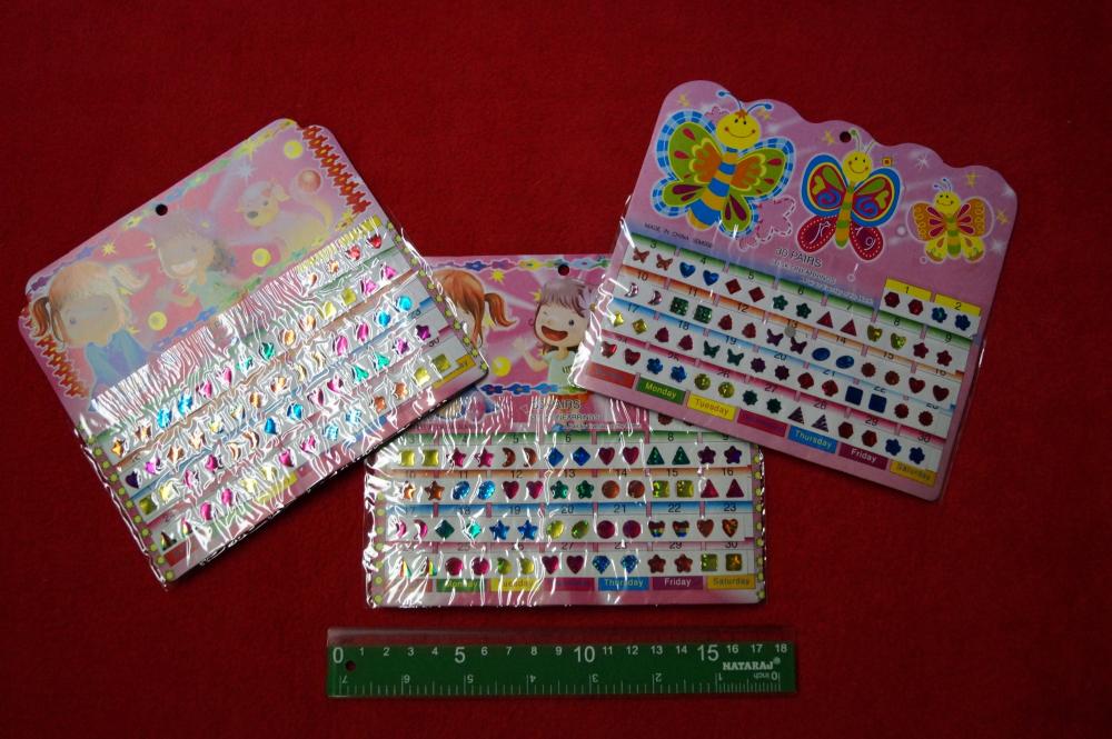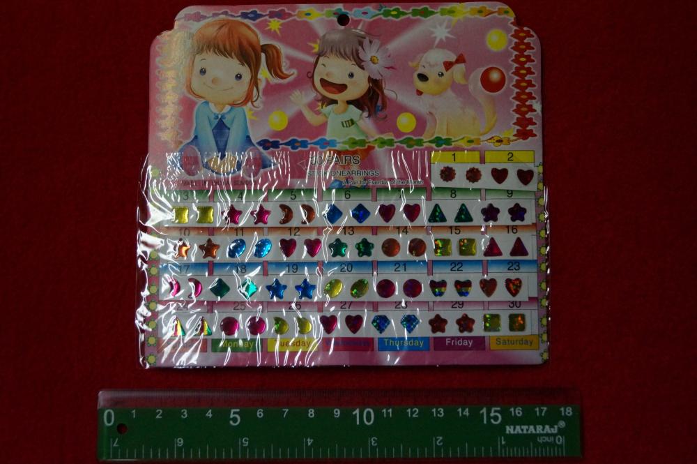 Przyklejane kolczyki dla dzieci. W opakowaniu 30 par różnych wzorów kolczyków. Jedna kartka to zestaw kolczyków na cały miesiąc. Każdego dnia inne kolczyki- świetna zabawa dla dzieci.