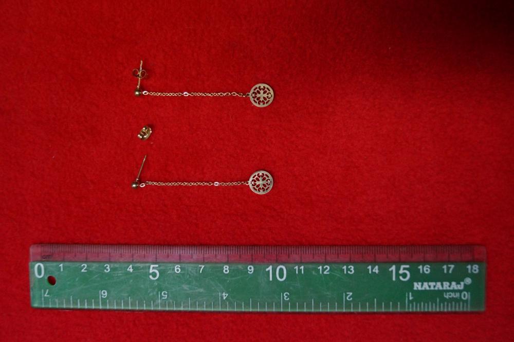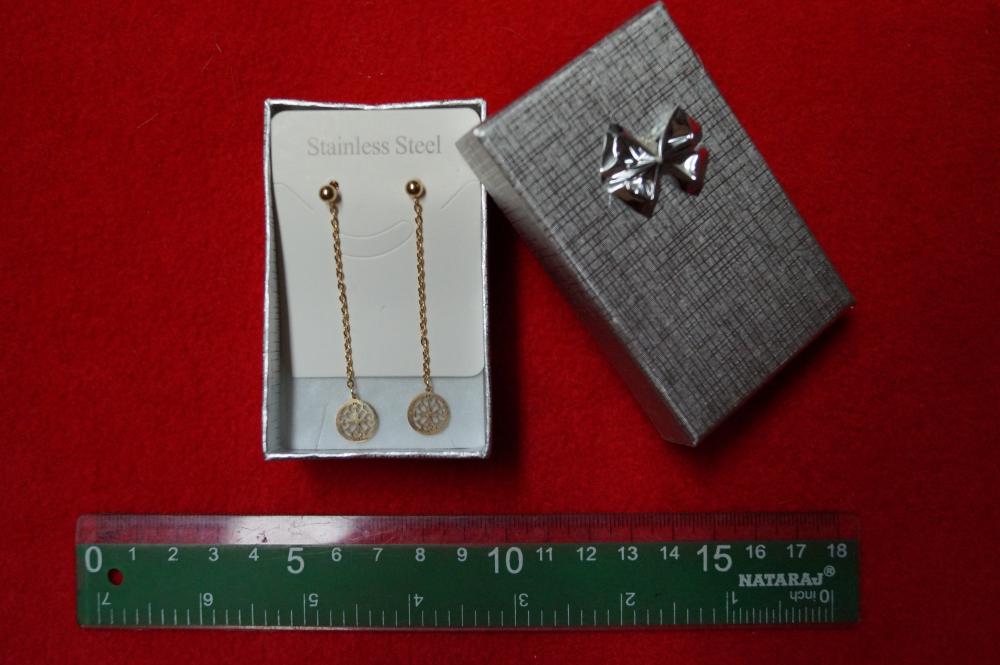 Kolczyki długie, wiszące z aplikacją "krzyż południa w kole". Biżuteria wykonana z wysokiej jakości stali chirurgicznej w kolorze złotym.Zapięcie typu sztyft (wkręt). Kolczyki elegancko zapakowane w ozdobne pudełko prezentowe. Idealne na prezent lub upominek. Różne wzory i kolory pudełek.
