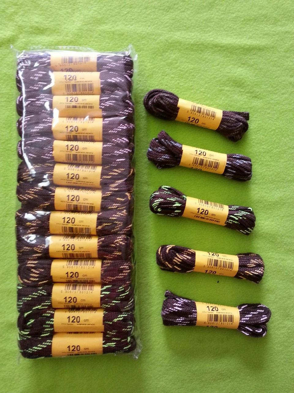 Sznurowadła 120 cm, płaskie, brązowe, w różnokolorowe "ciapki", op.25 par
