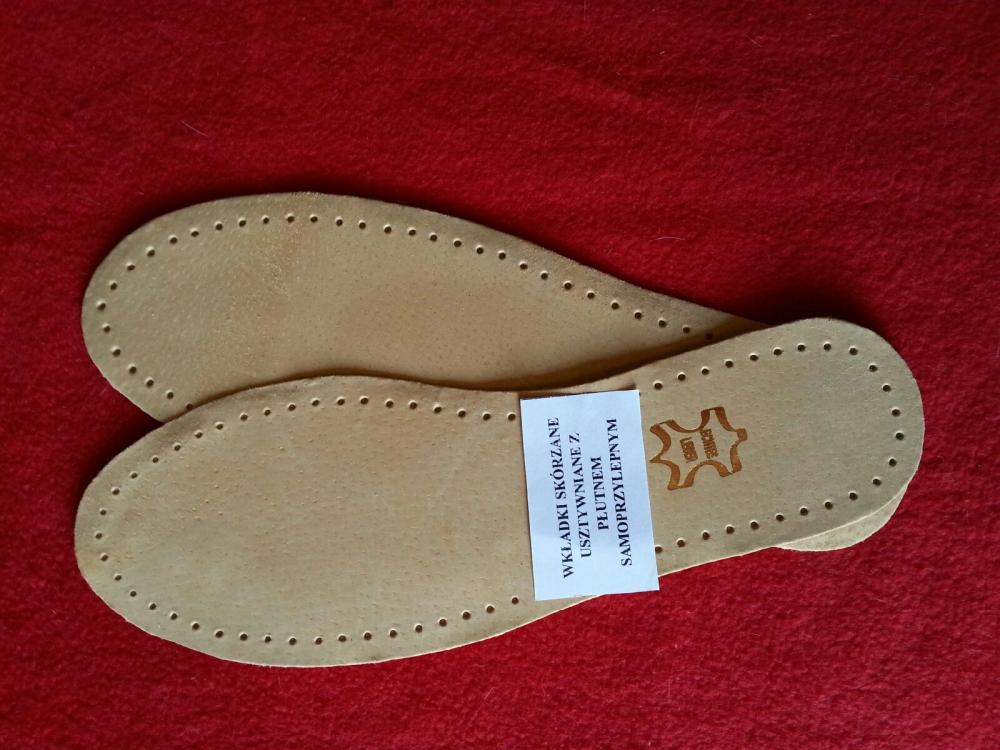 SAMOPRZYLEPNE WKŁADKI DO BUTÓW Z NATURALNEJ SKÓRY Wkładki przeznaczone są dla stóp wrażliwych. Dzięki ich strukturze przeciwdziałają odparzeniom, poprawiają wygodę, nie gromadzą wilgoci, zapobiegają brzydkim zapachom. Skóra dobrze przepuszcza powietrze, jest materiałem naturalnym, co powoduje redukcje uczucia zmęczenia stóp. Doskonałe do butów wizytowych a dzięki zastosowaniu usztywnionej siatki samoprzylepnej idealnie nadają się do sandałów i każdego innego obuwia.